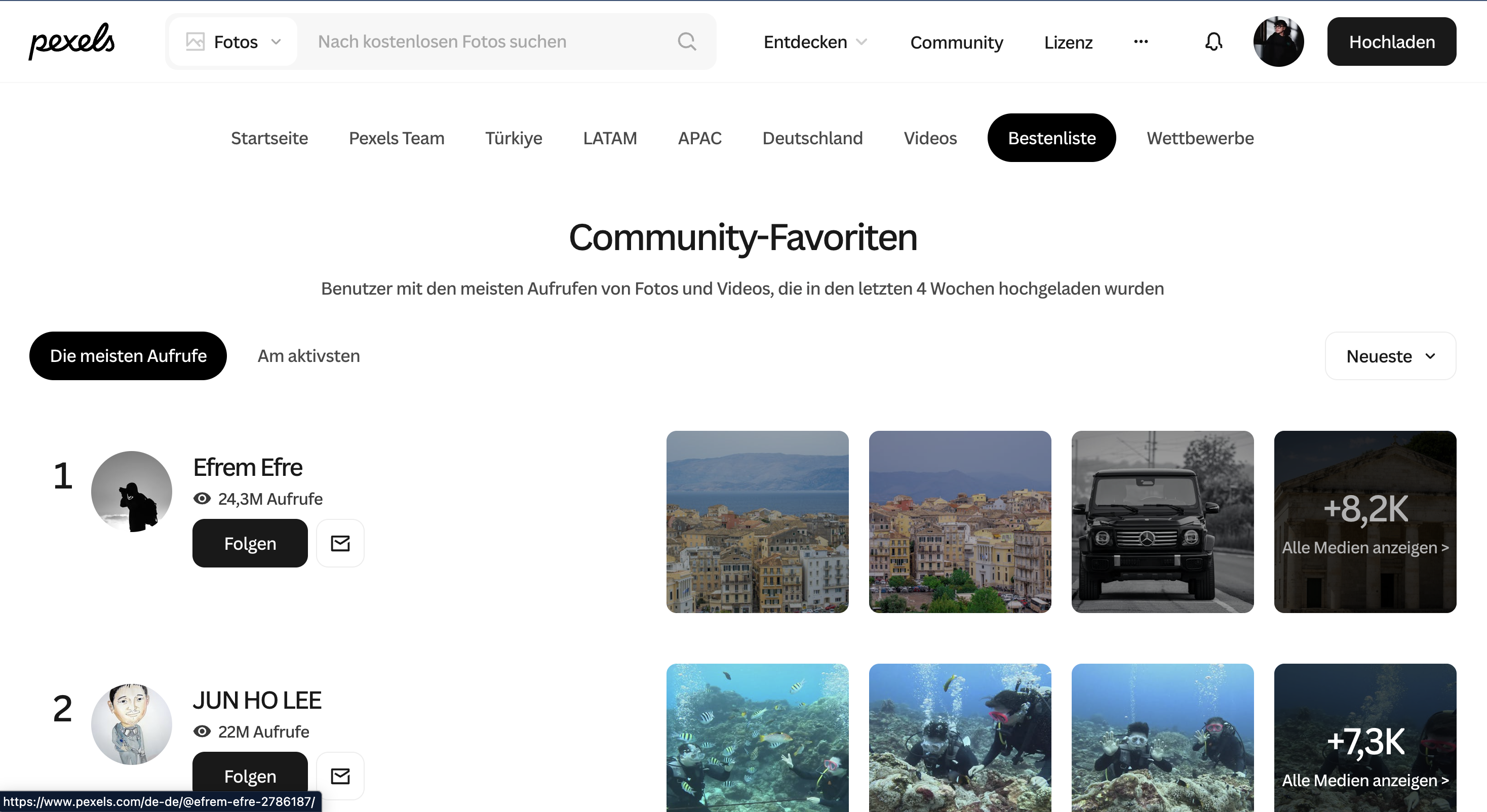 Die Pexels-Bestenliste zeigt die Mitwirkenden mit den meisten Aufrufen der letzten 30 Tage. Diese Statistiken basieren ausschließlich auf Fotos und Videos, die innerhalb der letzten 30 Tage hochgeladen wurden. Dadurch erhalten neue Pexels-Fotografen die Chance, schnell aufzusteigen.