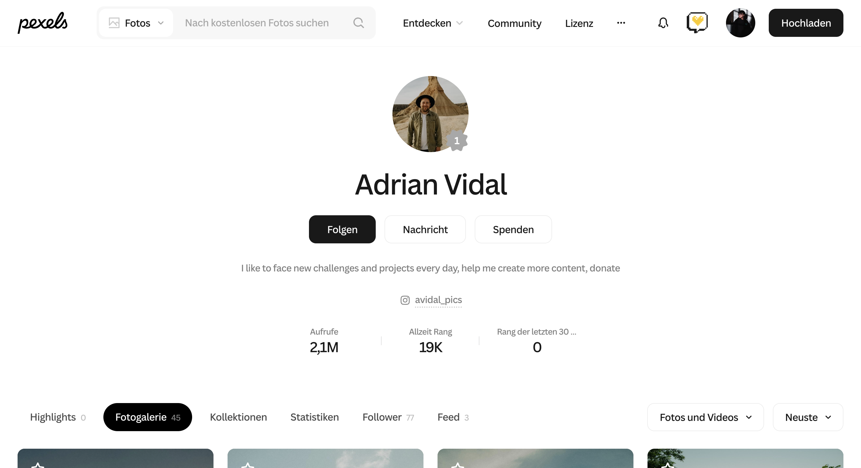 Wenn du mit der Maus über ein Bild auf Pexels fährst, siehst du eine Vorschau des Profils des Creators. Dort kannst du auf Folgen klicken, um dieser Person zu folgen und über neue Inhalte informiert zu bleiben. Du kannst einem Creator auch direkt über die Profilseite folgen.