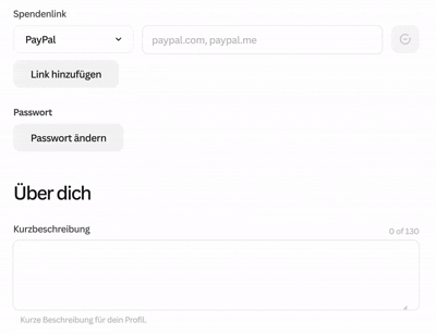 Geben Sie einen Link zu Ihrer öffentlichen Spendenseite ein (z. B. paypal.me/benutzername oder buymeacoffee.com/benutzername). Sie können mehrere Spendenservices hinzufügen, indem Sie auf „Link hinzufügen“ klicken.