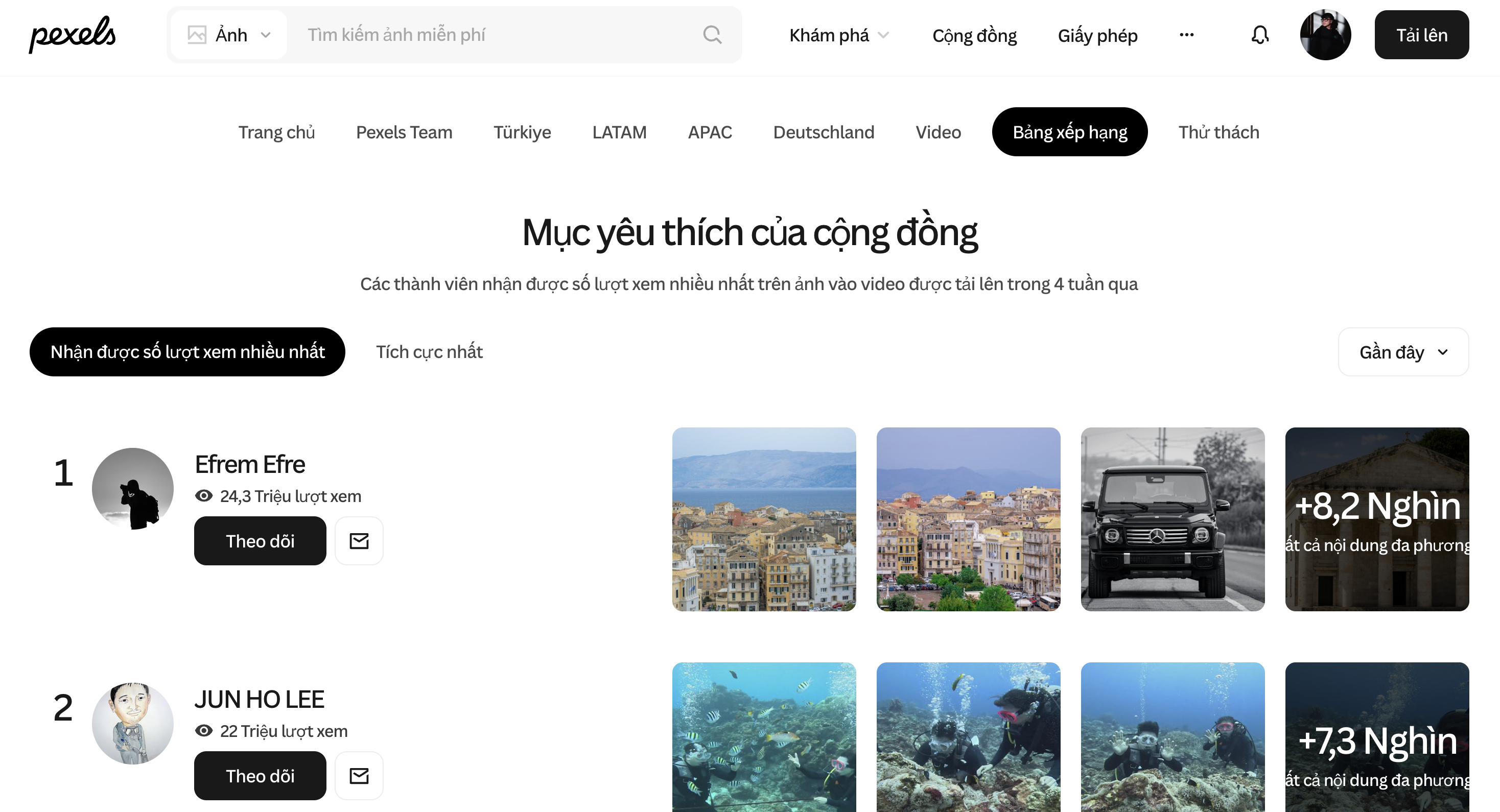 Bảng xếp hạng của Pexels hiển thị các nhà đóng góp có lượt xem nhiều nhất trong 30 ngày qua. Số liệu này chỉ tính dựa trên những ảnh và video được tải lên trong vòng 30 ngày gần nhất nhằm tạo cơ hội cho các nhiếp ảnh gia mới nổi.
