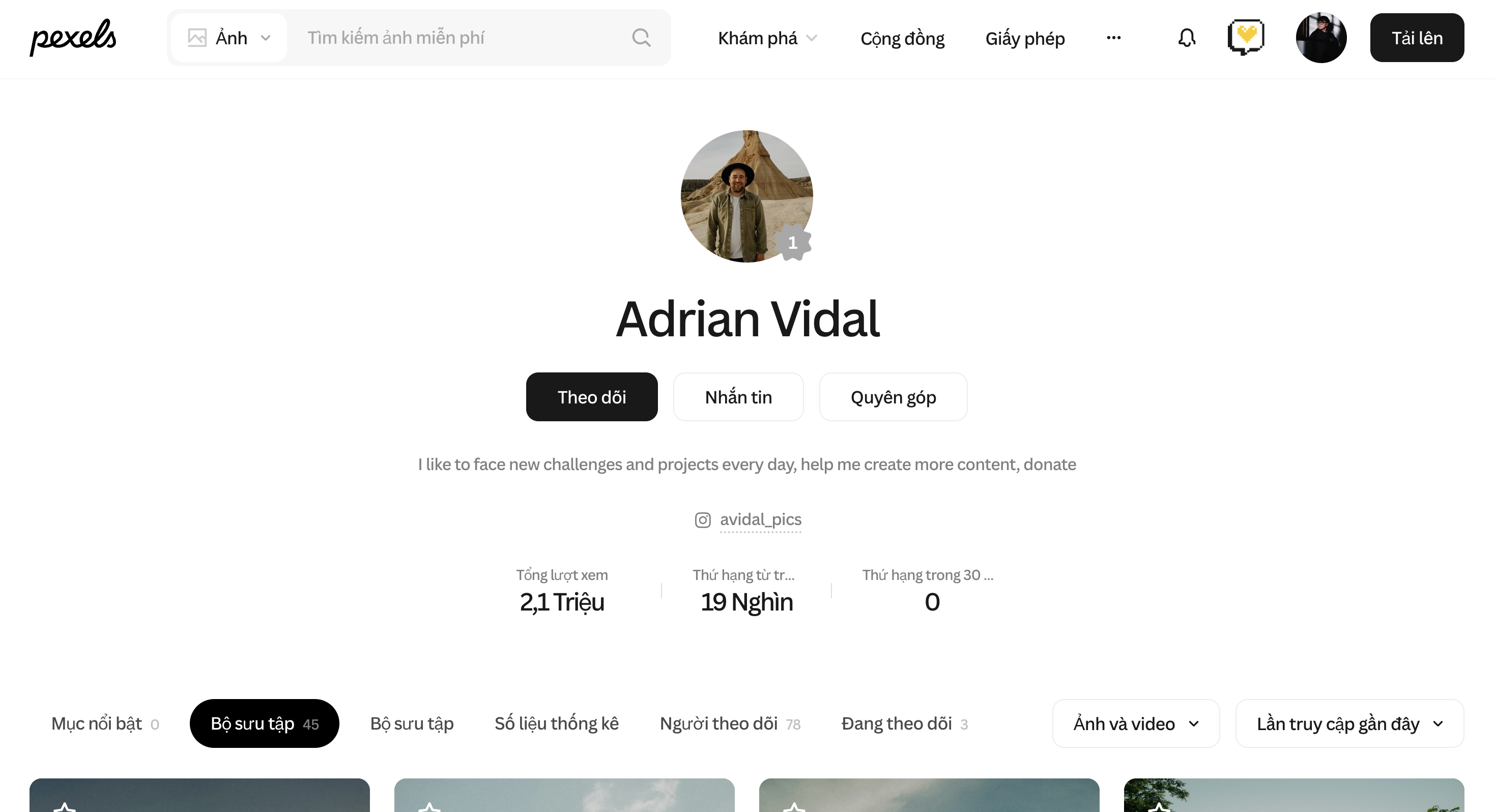 Khi bạn theo dõi một người sáng tạo trên Pexels, các nội dung tải lên mới của họ sẽ xuất hiện trên trang chủ khi bạn đăng nhập và xem tab Đang theo dõi.