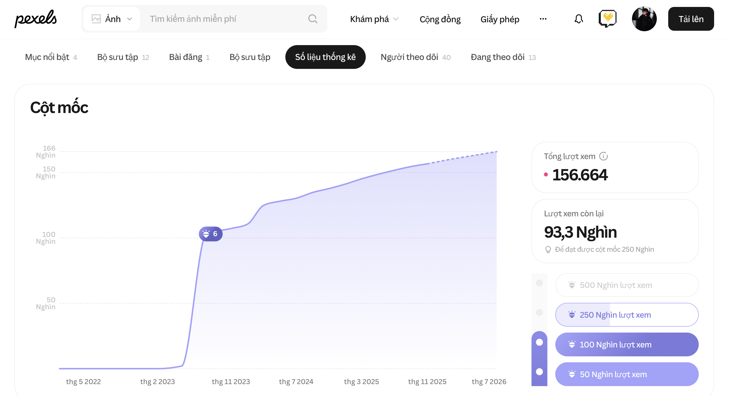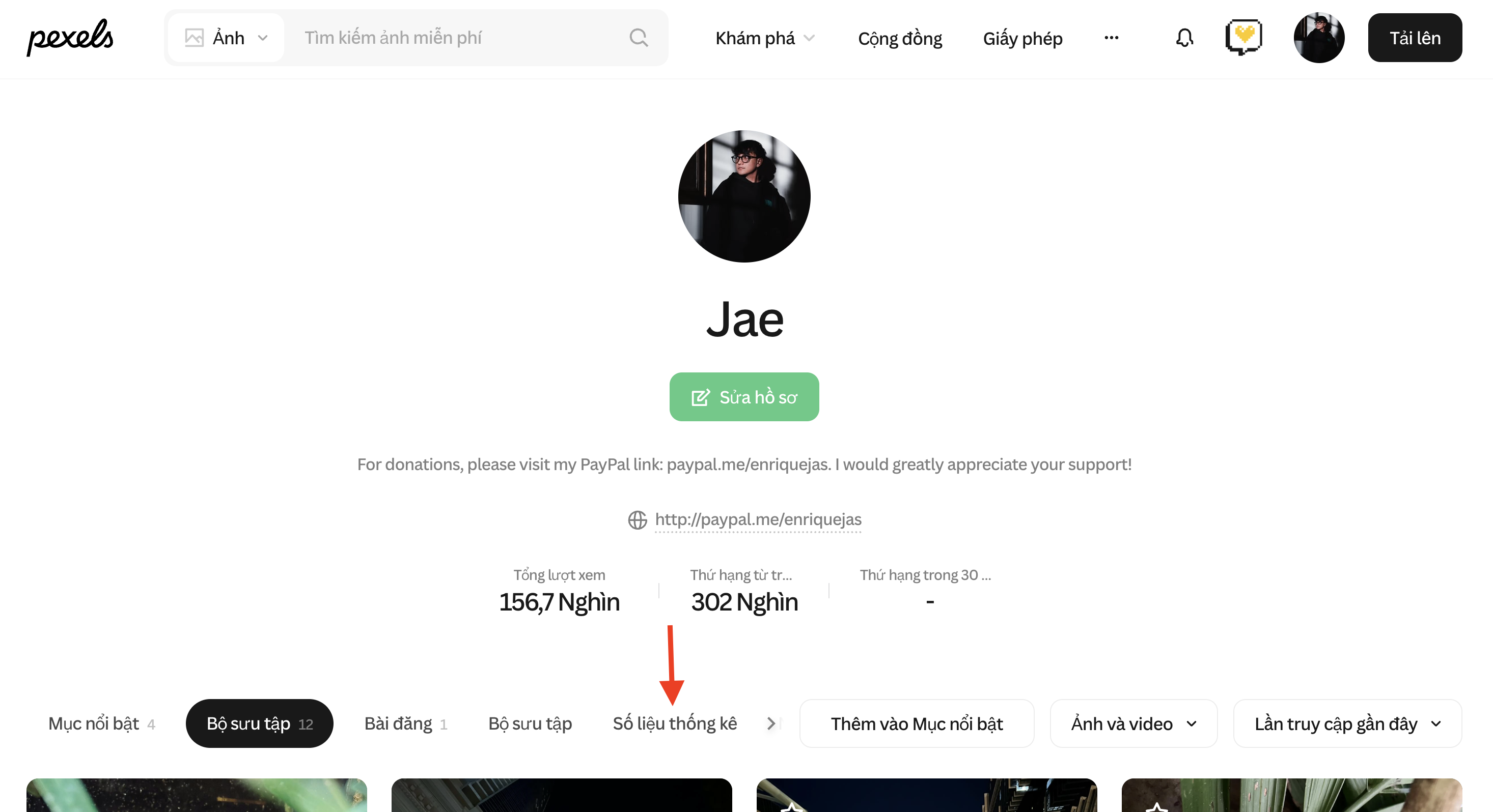 Với tư cách là nhiếp ảnh gia trên Pexels, việc thấy thống kê tăng lên là một trong những điều thú vị nhất. Bạn có thể xem thống kê của mình bằng cách vào trang hồ sơ và chọn Stats.